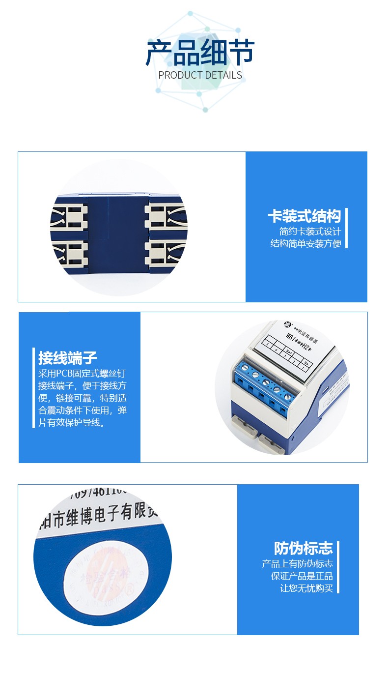 本產(chǎn)品采用特制隔離模塊,對電網(wǎng)和電路中的交流電流進(jìn)行實時測量,將其變換為0~5V、0~10V或1V~5V直流電壓(Uz)輸出;具有高精度、高隔離、低功耗、低漂移、溫度范圍寬、抗干擾能力強(qiáng)等特點。本產(chǎn)品采用卡裝式結(jié)構(gòu),端子接線,安裝方便,使用交流220V電源供電,輸入、輸出、電源之間兩兩隔離。